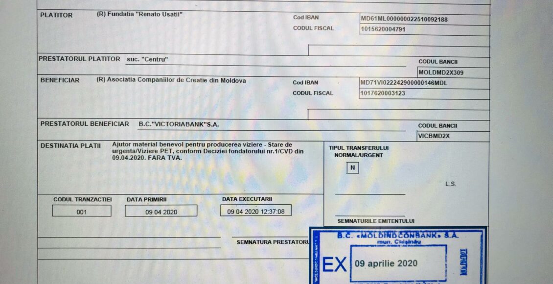 Fundația “Renato Usatîi” a transferat 10 mii de euro voluntarilor din Moldova care produc viziere de protecție împotriva noului coronavirus. Renato Usatîi a făcut anunțul la emisiunea “Cutia Neagră”, de la TV8.